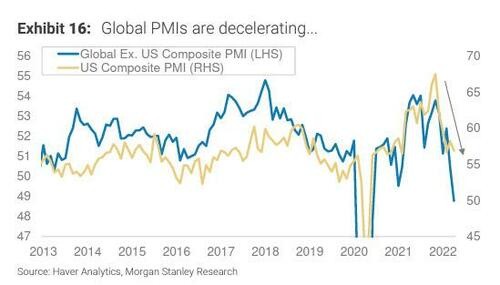 從增長率的角度來看,公司盈利增長率超過前一個週期的峯值後,現在開始減速。積極經營槓桿帶來的早中期收益已經過去,美國企業現在將面臨着銷售增長減速和成本上升的局面,利潤率壓縮和增長放緩將導致盈利增長放緩。再加上採購經理人指數(PMI)的減速,Wilson 預計明年的收益增長將出現下滑。