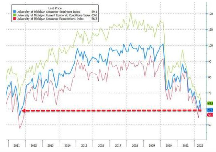 美國 5 月密歇根大學消費者信心大幅不及預期,刷新 2011 年以來的最低。通脹依然是數據低迷的 “禍根”,影響了人們對經濟的展望。消費者的耐用品採購計劃因價格高企而跌至歷史新低。