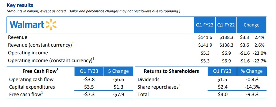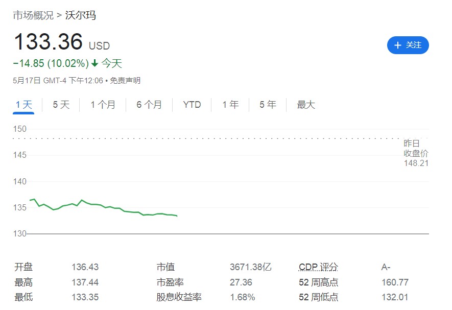 美東時間 5 月 17 日週二,美國最大的零售商沃爾瑪發佈了其截至 2022 年 4 月 30 日的第一季度財報,數據顯示,公司營收高於分析師的預期,每股收益低於分析師的預期。因受到產品、供應鏈和員工成本增加的影響,沃爾瑪利潤受到侵蝕,沃爾瑪股價週二大幅走低,跌幅達 10%。