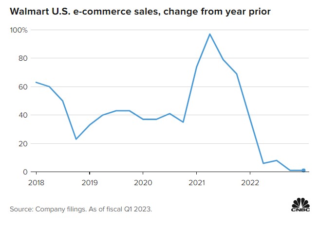 相比之下,上幾個季度得益於疫情居家下,沃爾瑪已經成功地實施了自己在電子商務戰略領域的抱負,公司走上了和亞馬遜等在線零售商抗衡的正確道路。其在線銷售對同店銷售增長的貢獻越來越大,過去兩年中增幅高達 87%。然而,本季度同比增長 1%,相比同期 37% 的增速逐步暴露出在後疫情時代電商渠道的增長乏力。不過參照亞馬遜的在線銷售業務,其第一季度的淨銷售額比去年同期下降了 3%。