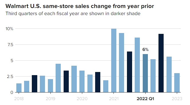 實際上,過去 3 個月,沃爾瑪的股價表現優於標準普爾 500 指數大盤,尤其是在市場正經歷修正階段,沃爾瑪股價上季度累計上漲逾 10%,財報發出前沃爾瑪以 2% 的漲幅遠遠跑贏大盤。但是面臨着包括全球供應鏈的中斷,勞動力短缺,燃料成本上升等推動美國通脹居高不下,連老牌零售商沃爾瑪也扛不住了。