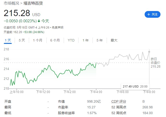 5 月 18 日美股盤前,美國零售業巨頭塔吉特公佈了其遠低於市場預期的 2022 財年一季度財報。報告期,內公司總營收為 251.7 億美元,同比略增 4%,市場預期值為 244.7 億美元;淨利潤 10.09 億美元,同比大幅下滑 51.9%;每股收益為 2.17 美元,低於華爾街預期的 3.07 美元,較去年同期 4.2 美元大幅下滑。