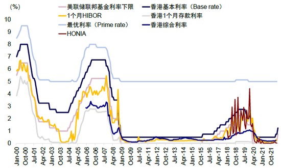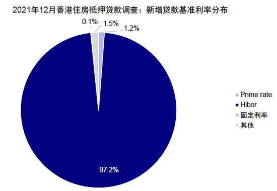 2)香港加息和利率走高或使本地地產邊際承壓。聯繫匯率機制下,金管局跟隨美聯儲加息以及 Hibor 大概率繼續走高,將會提升香港本地的部分融資成本,進而可能對本地房地產融資帶來部分壓力。據 2021 年 12 月調查顯示,香港 97.2% 的新發住房抵押貸款與 Hibor 利率掛鈎,1 個月的 Hibor 是住房貸款主要基準。