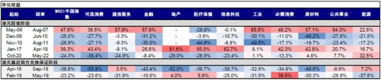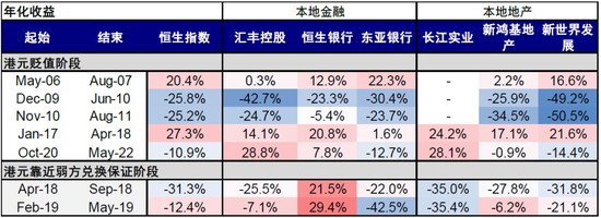 1)單純香港利率上行和港幣走弱並非港股的主導因素。1985 年以來數據顯示,1 月 Hibor 與恒指月度收益的相關性僅為-7%,與恒生國企指數相關性為 11%。由於港股市場中資公司佔到相當比例,因此香港自身的金融條件對於港股整體的影響並非單一主導因素,相比之下國內增長和基本面狀況更為重要,以 2017 年為例,即便面臨美聯儲加息和縮表、港幣整體走弱且 Hibor 抬升,但海外資金依然持續流入,推動人民幣走強和港股市場大漲。板塊層面,由於樣本較少沒有確定性的一致規律,更多還是有當時基本面環境和行業中觀環境決定。