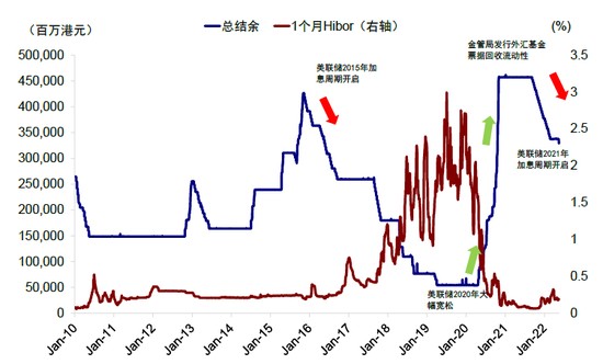往前看,在通脹仍有粘性的環境下,美聯儲緊縮將是未來一段時間的強約束,短期內難以逆轉,至於是否會再超預期則取決於通脹路徑和供給矛盾的緩解速度。這一背景下,美元流動性收緊和金管局跟隨美聯儲加息、Hibor 利率走高也將是大概率情形,這進而不排除仍會給港幣造成一定壓力,尤其是疫情緩解和穩增長有效發力吸引海外資金明顯回流之前。參考 2015-2018 年美聯儲加息週期,香港銀行總結餘由 2015 年末的 4200 億港幣降至 2019 年初的 590 億港幣,同期 1 個月 Hibor 從 0.22% 上升至 2% 以上。當前總結餘約為 3300 億港幣,不排除仍有回落空間(但總結餘下降並不直接等於資金流出)。我們認為上述變化可能產生以下一些影響: