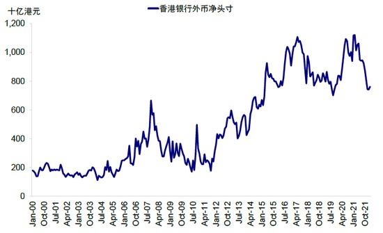 實際上,2022 年初以來,隨着美國金融條件收緊,Hibor-美元 Libor 利差不斷收窄並於 2 月初轉為倒掛,類似於近期中美利差倒掛,也帶來了一定匯率和資金壓力。由於外部資金流動通常會反應在香港銀行體系資產負債表中,我們可以通過香港銀行外幣淨頭寸來透視其變化。數據顯示,2021 年下半年至 2022 年 2 月,香港銀行外幣淨頭寸由 9680 億港幣下降至 6600 億港幣,與同期的港幣匯率走弱和利差倒掛所反映的信息一致。
