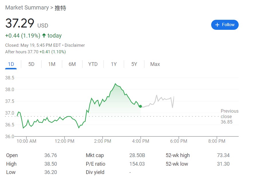 虽然推特高管信心十足认为交易可以达成,推特股价也瞬间转涨,但从收盘来看,市场可能并不买账,周四推特收跌 1.19% 报 37.29 美元,与商定的 54.20 美元的收购价相比低了 31%。