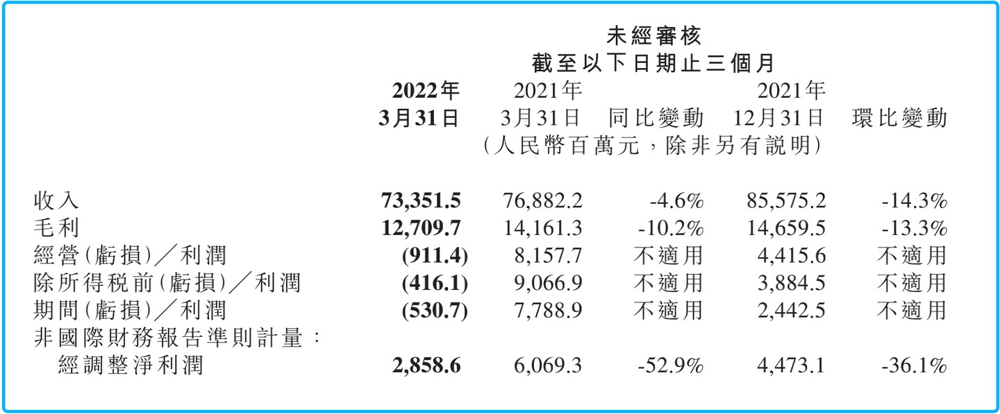 “2022 年第一季度,小米實現營收 733.52 億元,同比下滑 4.6%;期內虧損 5.31 億元,去年同期盈利 77.89 億元;調整後淨利潤 28.59 億元,同比下滑 52.9%。”