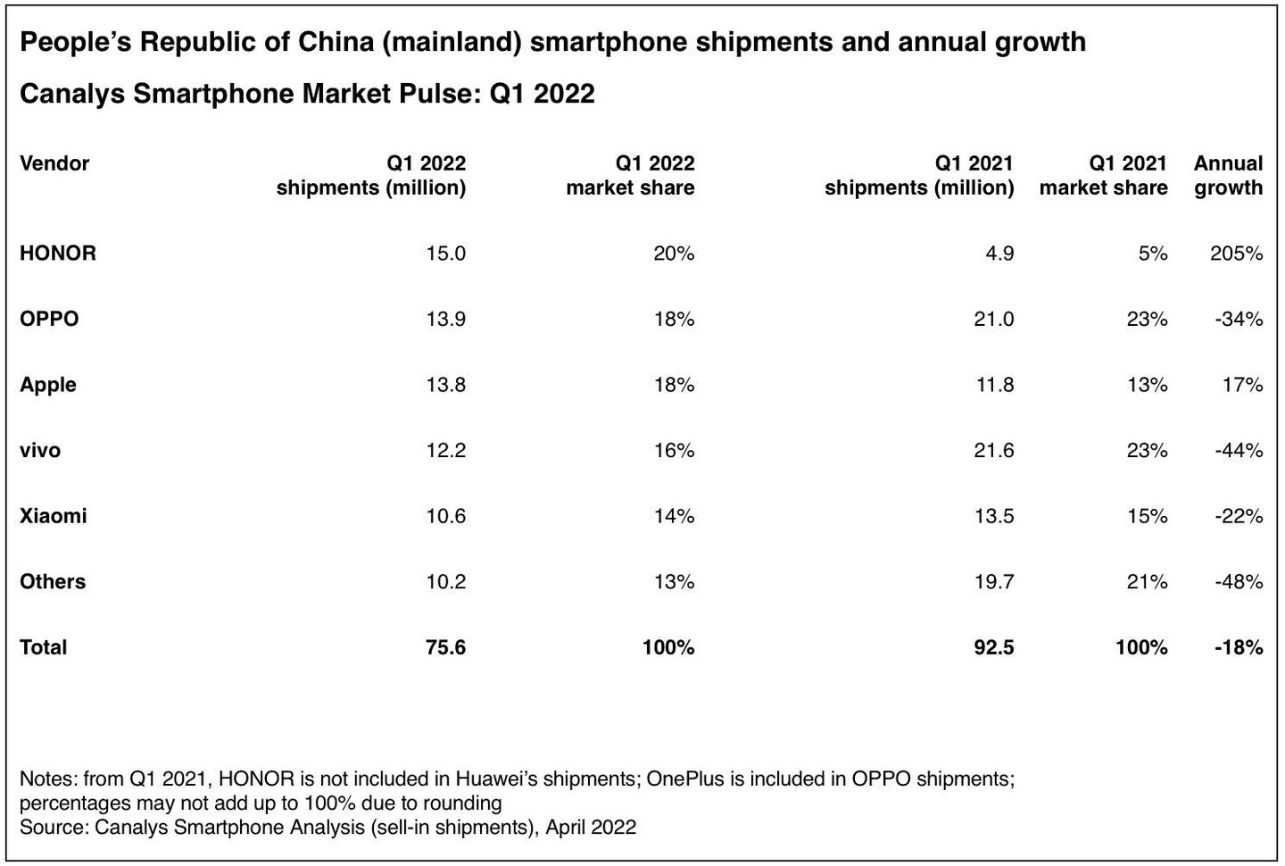 市場分析機構 Canalys 最新報告指出,2022 年第一季度,全球智能手機出貨量同比下降 11%。中國信通院的報告顯示,今年 1 至 3 月,國內市場手機總體出貨量為 6934.6 萬部,同比下降 29.2%。