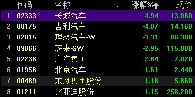 長城汽車跌超 5%,小鵬汽車跌超 4%,吉利汽車跌近 4%,理想汽車跌超 3%,蔚來跌近 3%。