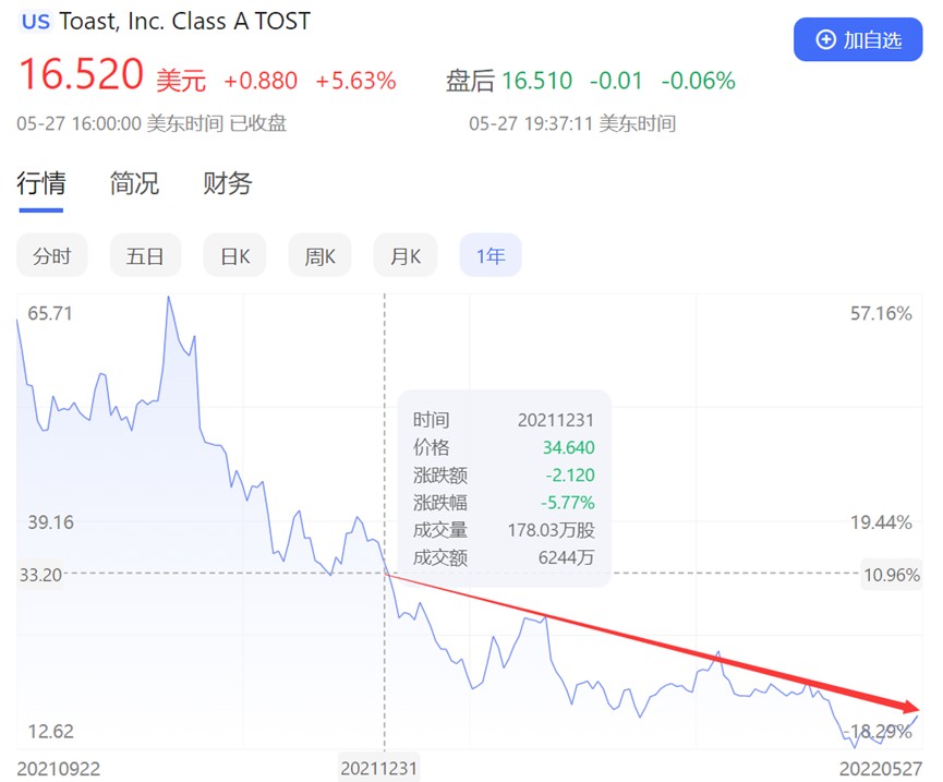 在 Toast 的第一季度財報電話會議上,財務主管 Elena Gomez 預計,該公司 2022 年下半年的利息、税項、折舊和攤銷前利潤將比上半年高 2 個百分點。但今年迄今,Toast 股價同樣已經腰斬,現報 16.52 美元/股。