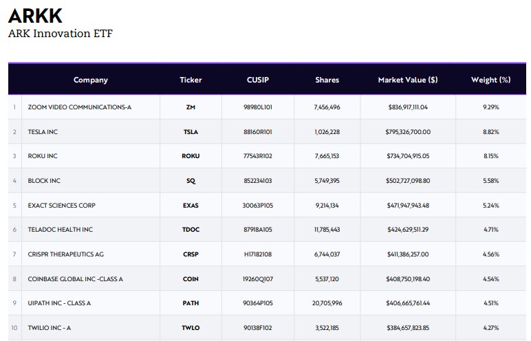 ARKK 這波反彈主要由幾隻重倉股帶動,其中頭號重倉股 Zoom 在此期間上漲 29%,第三大重倉股 Roku 上漲 11%,第四大重倉股 Block 上漲 17%,第八大重倉股 Coinbase 上漲 24%。