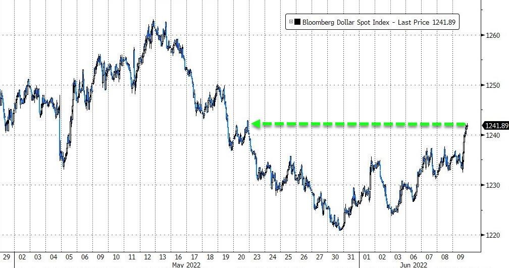 到週四美股收盤時,美元指數處於 103.30 上方,日內漲近 0.8%;彭博美元現貨指數漲近 0.7%,處於 5 月 20 日以來高位。