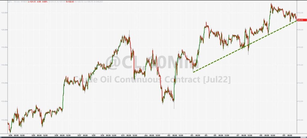 國際原油期貨在連漲兩日後回落。美國 WTI 7 月原油期貨收跌 0.49%,報 121.51 美元/桶,雖然跌離截至週三連續兩日所創的 3 月 8 日以來收盤高位,但連續兩日收於 120 美元上方。布倫特 8 月原油期貨收跌 0.41%,報 123.07 美元/桶,週三刷新上週二 7 月合約突破 122 美元所創的 3 月 8 日以來高位。