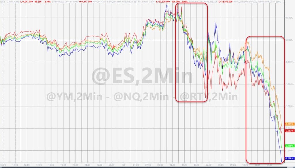 三大美國股指集體低開,納斯達克綜合指數盤初刷新日低時跌超 0.9%,早盤曾短線轉漲,午盤和標普 500 指數及道瓊斯工業平均指數均加速下跌。尾盤刷新日低時,標普和納指分別跌近 2.4% 和 2.8%,道指跌超 640 點、跌近 2%。