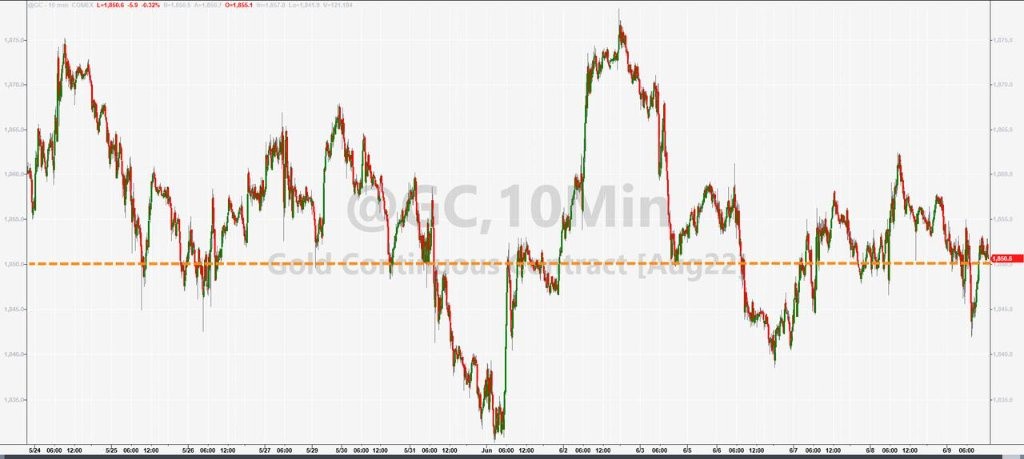 紐約黃金期貨結束兩日連漲,COMEX 8 月黃金期貨收跌 0.2%,報 1852.80 美元/盎司,還未跌至週一跌破 1850 美元所創的 5 月 20 日以來收盤低谷。