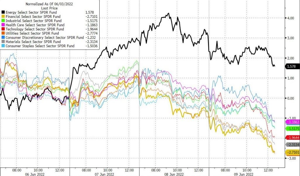 三大美股指至少跌近 2%、均創三週最大跌幅,道指跌超 600 點。Meta 跌超 6%、所在板塊領跌標普。盤中曾漲超 5% 的特斯拉收跌。中概回落,B 站跌近 15%,蔚來跌超 7%。泛歐股指創兩週最大跌幅及兩週新低,電力巨頭 EDF 漲超 6%。10 年期美債收益率創近一個月新高,德債收益率續創八年新高、日內曾升逾 10 個基點,意債收益率升逾 20 個基點。美元指數創三週新高,日元四日連創二十年新低。英國天然氣漲 16% 創逾三週最大漲幅,歐洲天然氣漲近 7% 創四周最大漲幅。美油告別一個月高位,仍處 120 美元上方;美汽油歷史新高。黃金結束兩連漲。倫錫終結七連陽跌離一個月高位。