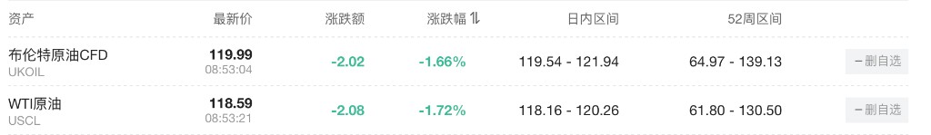 黃金小幅上漲,國際油價跌超 1%,截至發稿,布倫特原油跌 1.66%,報 119 美元/桶,WTI 原油跌 1.72%。