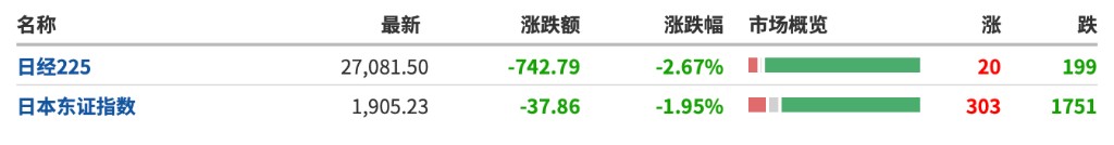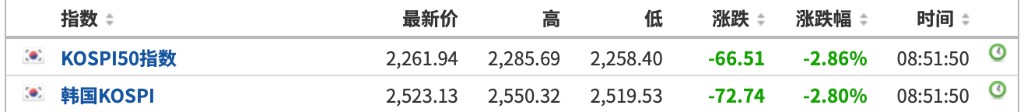 亞太市場追隨美股跌勢,日韓股市明顯低開,跌幅持續擴大。日經 225 指數低開 1.6%,跌幅隨後擴大至 2.67%;東證指數低開 1.5%,目前跌 1.95%。韓國首爾綜指低開 1.8%。