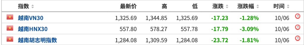 越南股市大跌,越南 HNX30 指數跌超 3%,澳大利亞 S&P/ASX200 指數跌至 1.25%。