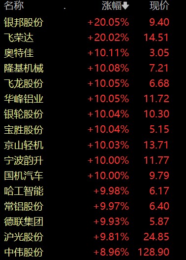 特斯拉涨价提振市场情绪,A 股市场特斯拉概念股午后继续冲高。银邦股份、飞荣达 20CM 涨停,奥特佳、隆基机械、华峰铝业、常铝股份、德联集团等 10 多股涨停。