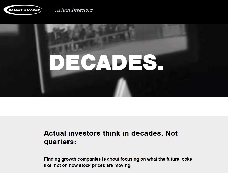 Baillie Gifford 的官網寫着:Actual investors think in decades. Not quarters:Finding growth companies is about focusing on what the future looks like, not on how stock prices are moving.(真正的投資者放眼數十年,而非幾個季度:尋找成長型公司的重點是關注未來的樣子,而不是股價的走勢。)
