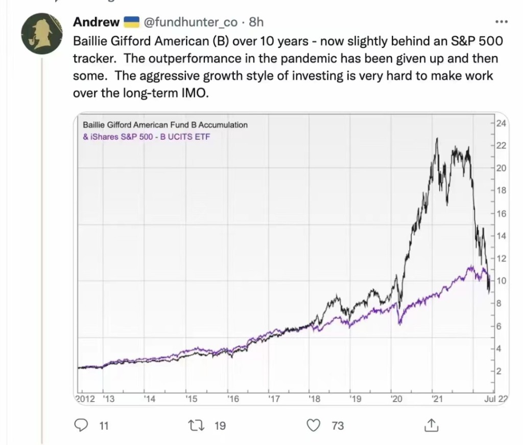 Baillie Gifford 的風格是抓住時代優質的成長股,但在全球加息的背景下,成長股們回撤猛烈,導致近期 BG 的業績難看。