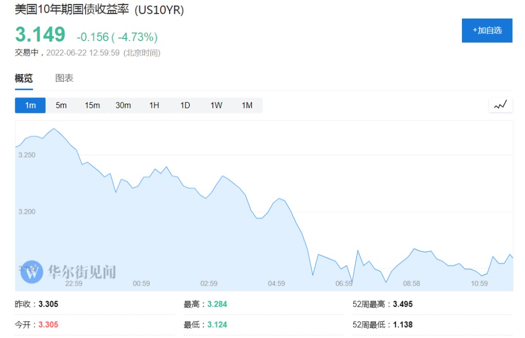 今早鮑威爾講話後,美國國債收益率全線重挫,對經濟衰退的擔憂促使投資者湧入相對安全的美債市場避險。午盤時間,對貨幣政策敏感的 2 年期國債收益率下跌 12 個基點至 3.08%左右,10 年期國債收益率下跌 11 個基點至 3.16%,上週徘徊在 3.5%附近,埃文斯講話後再次震盪下挫至 3.149%.