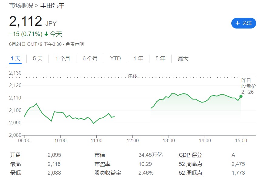 消息發佈後,6 月 24 日週五,豐田股價下跌 0.7%,報收 2112 日元。