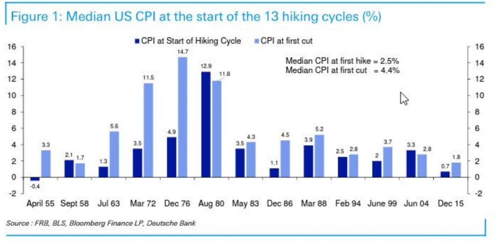 1、首次加息時的 CPI 中值僅為 2.5%,意味着美聯儲往往在通脹上升的較早階段採取應對措施。然而,這一次他們沒有,而是等美國通脹率達到 8.5%。