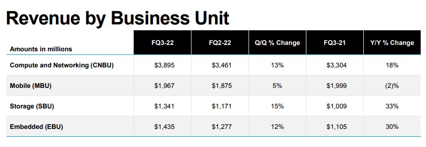 計算機和網絡業務部(CNBU)錄得 38.95 億美元的營收,同比增加 18%,環比增長 13%;