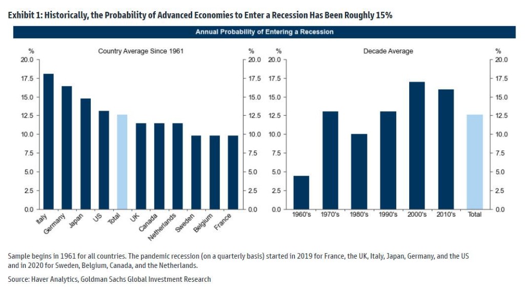 高盛重新審視了有關經濟衰退方面的頻率和程度,並認為美國經濟在明年陷入衰退的可能性約為 30%,歐元區的可能性約為 40%,在英國這一比例約為 45%。