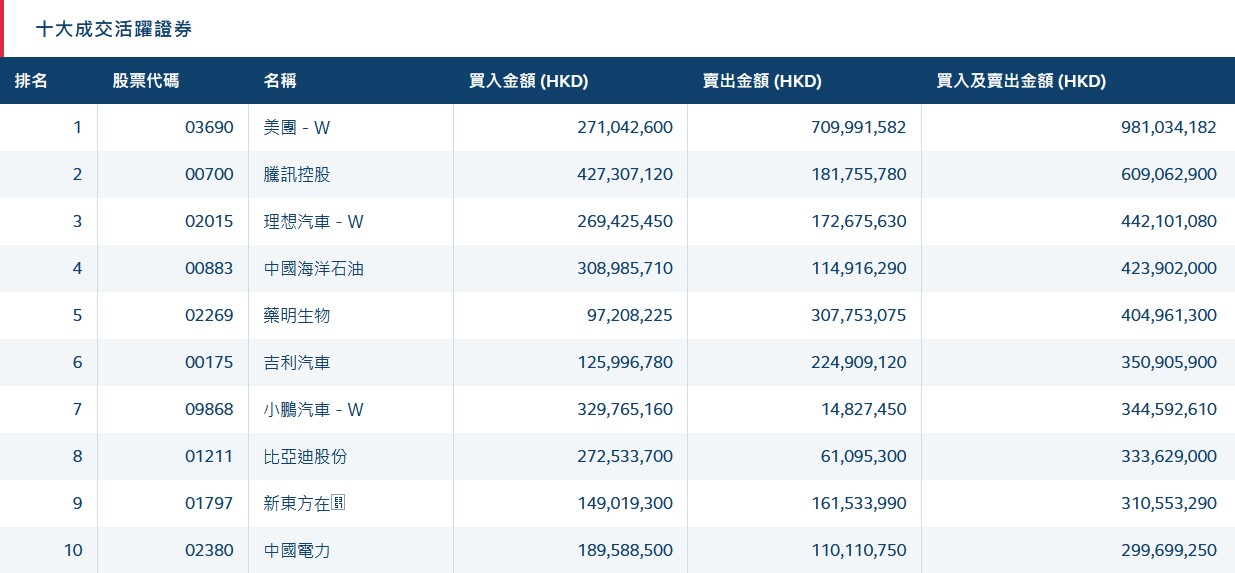 港股通 (深) 十大活躍成交股