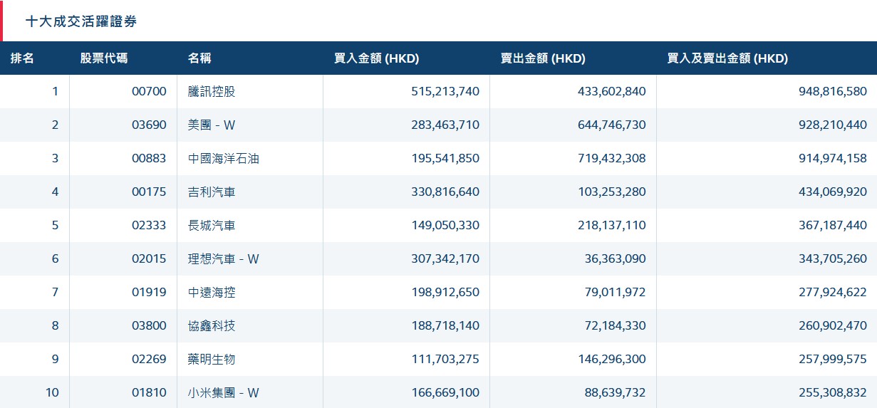 港股通 (滬) 十大活躍成交股