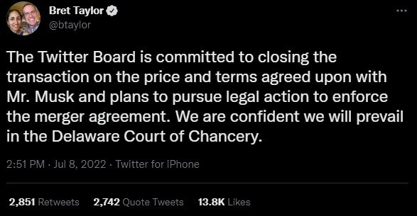 可如果馬斯克堅持咬定 Twitter 未遵守協議,根據 Twitter 董事會成員 Bret Taylor 的推文,公司將以違反合同為由將馬斯克起訴到特拉華州商事法院,Taylor 表示公司致力於按照達成的協議價格和條款完成交易。