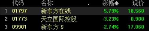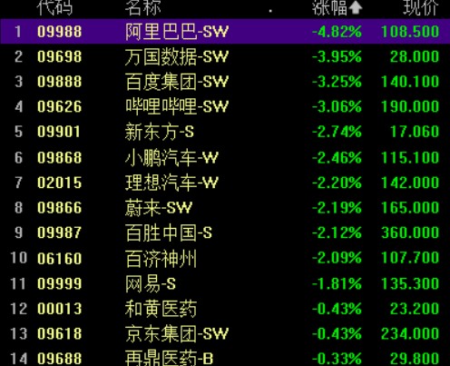 盤面上,科技股和教育股開盤下跌,阿里巴巴跌 5%,新東方在線跌近 5%。