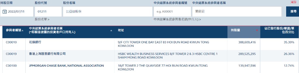 據港交所數據,截止 7 月 11 日,花旗銀行席位的比亞迪 H 股數量達到 3.886 億股,僅僅過一個週末,花旗席位便增加約 2.25 億股。數據還顯示,比亞迪在香港中央結算系統流通的股份總數增加了 20.49 個百分點。從截至 7 月 8 日公司已發行股份、認股權證和單位總數的 79.44%,上升至 7 月 11 日的 99.93%。