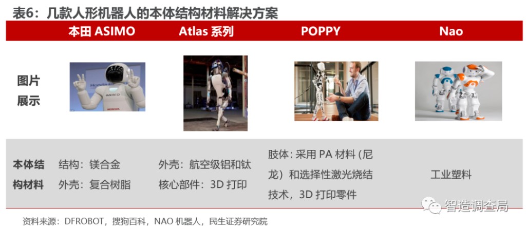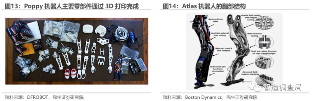 此外,一些机器人的关键零部件,可能会采用工业级 3D 打印技术。如历史上法国 INRIA Flowers 研发的 Poppy 机器人就是一种 3D 打印机器人,3D 打印可以降低机器人本体重量,并减轻伺服电机等关键部件的压力,从而降低成本,并实现快速制作。另外,像波士顿动力的 Atlas 机器人关键结构件也是使用工业级 3D 打印制作,驱动器和液压管路是被嵌入结构当中,所有的动态平衡、传感、过滤、排污阀、动力装置所需的一切零件,都集成在一个 3D 打印部件中而非由单独的组件制成。