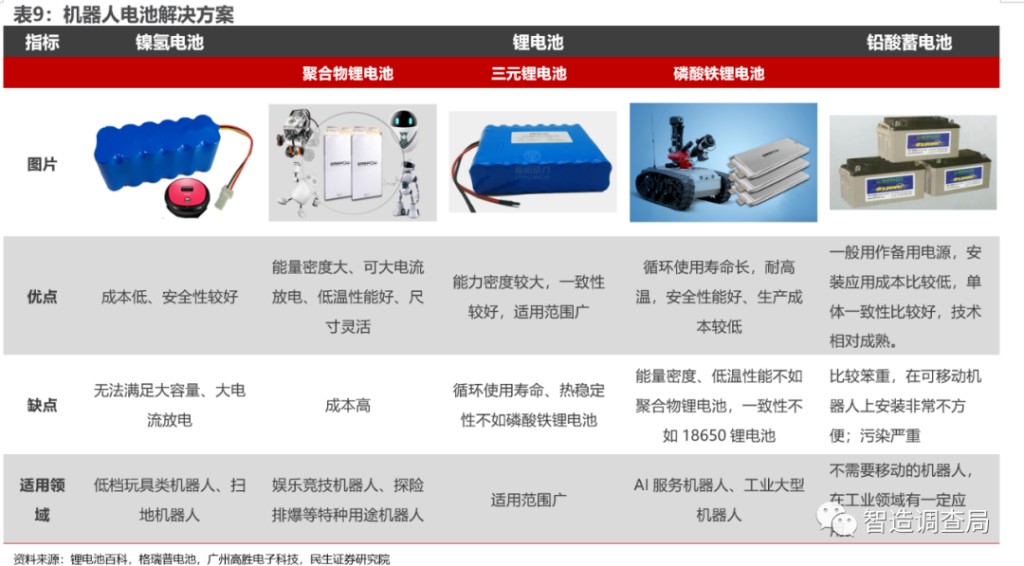 机器人的电池主要有镍氢电池、锂电池、铅酸蓄电池三类。其中,镍氢电池主要用于成本控制严格,不需要大容量和大电流放电、安全性要求较高的玩具机器人、扫地机器人等领域。铅酸蓄电池技术较锂电池更为成熟,但由于比较笨重,移动不方便,基本用于不需要移动的机器人领域,由于污染较为严重,正在逐渐被锂电池取代。
