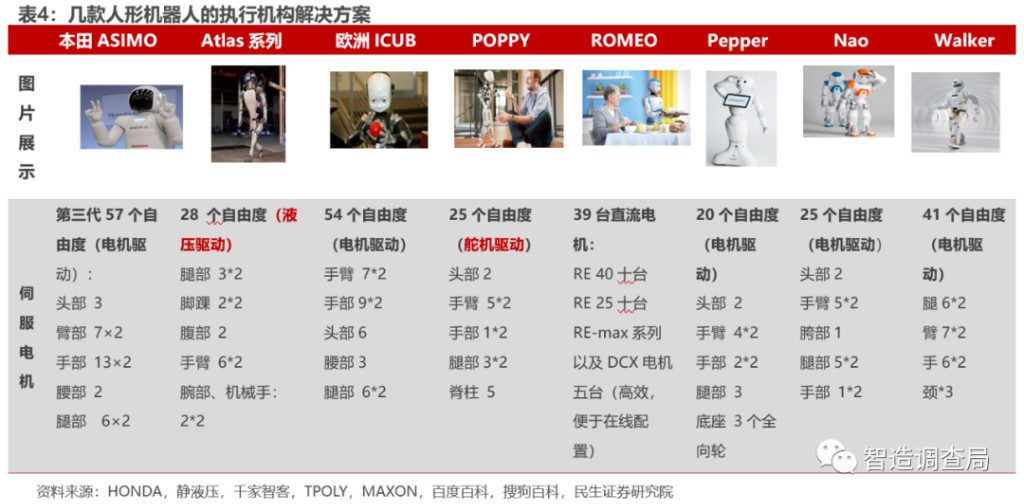 从数量上看,按照历史上已经发布的几款人形机器人,头部自由度一般至少有 2-3 个,每只手臂有 4-7 个自由度,每只手 1-5 个自由度,每条腿 3-6 个自由度,躯干(腰部)2-3 个自由度。根据澎湃新闻报道,预计特斯拉 Optimus 人形机器人的脖子、胳膊、手、腿、躯干累计搭载了 40 个机电传动器。基本与 Walker 和 ROMEO 的自由度数量相当。