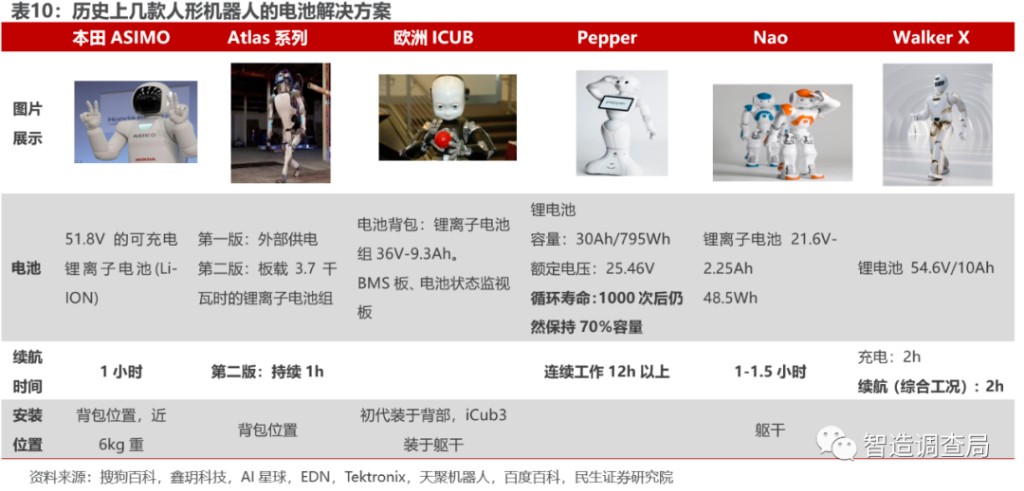 从发展历史上看,几款较为知名人形机器人主要经历了外部供电、电池供电两个发展阶段。电池供电普遍采用锂电池组,其安装的位置最初普遍采用 “背包” 形式,后逐渐将电池内置。从续航时间上看,大部分双足的人形机器人的连续工作时间都在 2 小时以内。然而,根据我们的产业链调研,目前机器人的价格主要停留在展示和实验阶段,若实现大规模商业化,其续航时间应达到 3-10 个小时不等。