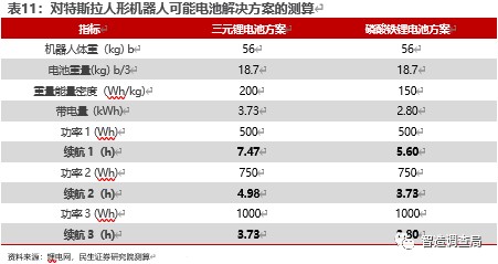 但前文提到,目前的几款知名人形机器人主要停留在展示和实验阶段,因此电池做到越轻量越好。而根据我们的产业链调研,若要实现大规模商业化,其带电量和续航可能有更高的要求,相对应地,一般电池重量应占到人形机器人重量的 1/3 左右。根据 OFweek 锂电网,目前磷酸铁锂电池的能量密度一般为 150Wh/kg,三元电池的能密度约为 200Wh/kg。假设特斯拉人形机器人体重 56kg,电池重量占比 1/3 计算,则其锂电池重量约为 18.7 克,若采用三元锂电池,则带电量约为 3.73Wh,续航时长在 3.73-7.47 小时,若采用磷酸铁锂电池,带电量约为 2.8kWh,续航时间在 2.8-5.6 小时。