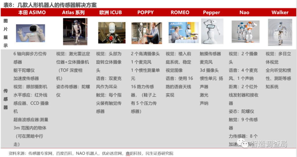 从已经发布的几款人形机器人来看,视觉、语音、触觉、力觉、测距、姿态等需要基本都需要配备相应的传感器,传感器的数量少则十数个,多则上百个(如 Nao 机器人)。一般视觉传感多采用双目或多目的高清摄像头、立体摄像机,姿态传感器采用陀螺仪,探测器包括激光雷达、声纳、超音波感应器等,语音识别多以麦克风形式。