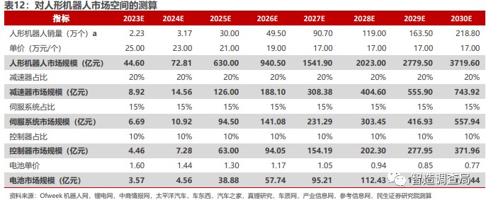 对各个零部件市场规模的测算:按照前文提到的,减速器、伺服系统、控制器在人性机器人中的占比计算,可以分别测算出三个对应的市场规模,预计到 2025 年人形机器人减速器、伺服系统、控制器市场规模分别达到 126 亿元、95 亿元、63 亿元,到 2030 年,市场空间分别达到 744 亿元、558 亿元、372 亿元。
