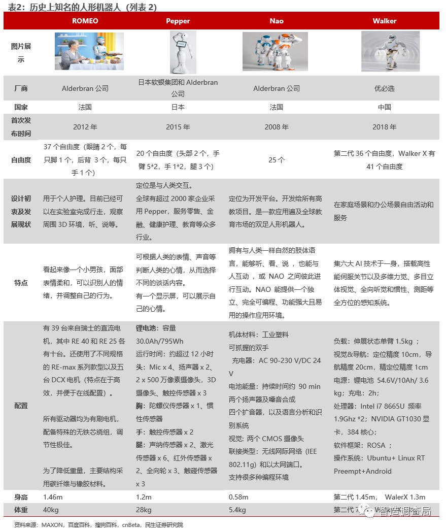 从配置上看,双足服务型机器人自由度均在 40 个左右,多的可以达到 50 以上,电源采用锂电池,续航时间短则 1-2h,长的可以达到十数个小时,电机均采用直流电机,全身配备数十个甚至上百个传感器,本体结构多采用碳纤维、工业塑料等轻质材料,或对质感、触感有要求的橡胶等。