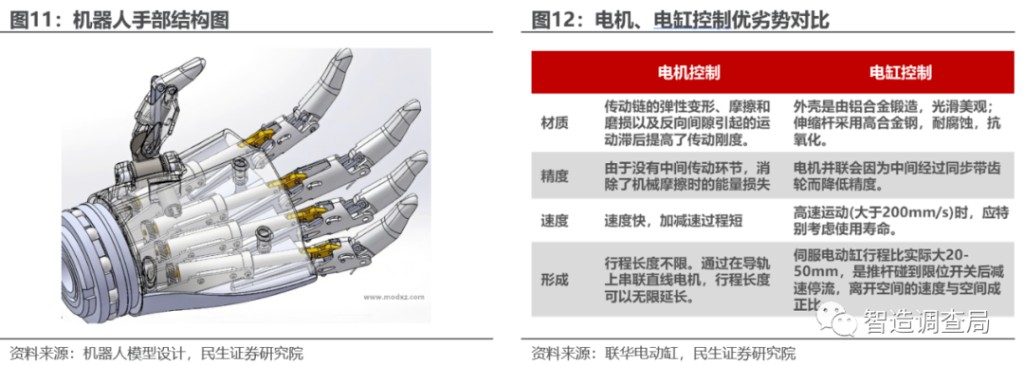 从组成上看,人形机器人的伺服电机、驱动器、编码器、减速器等集成在一起,整体组成一个 “空心杯” 形状的集合,整个杯形的集合体有输入端、输出端,通过一根总线、一根电源线,跟控制器联系在一起。由于人的手臂、躯干都是圆形,因此做成杯形更利于本体的安装。一般,人形机器人每个关节都要一个杯形的集合体,一个手指上面需要一个电机,手指上各关节可以通过拉线的方式,利用杠杆原理实现弯曲。此外,人形机器人各伺服系统之间是采用串联方式,工业机器人一般采用并联方式。