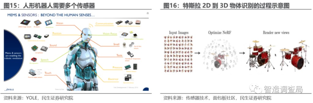 由于人形机器人不仅需避障、路径规划,还需要准确识别目标,因此若要完成类似人手的精密操作,机器人视觉系统定位精度需达毫米级,需引入工业级双目/多目相机,单机价值量相对普通服务机器人较高。预计人形机器人的 3D 传感器成本将远高于普通的服务机器人,但要略低于工业机器人。此外,激光雷达通常会作为视觉传感的辅助,因为在机器人工作过程中,很多物体都是 “眼见为虚” 的,需要借用激光雷达对景深进行验证。