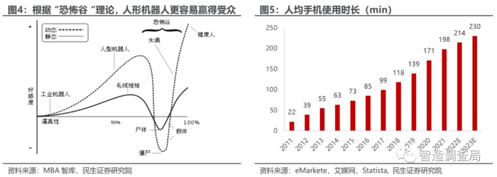 人形机器人较其他服务机器人更容易被人们接受。参照 “恐怖谷效应”,在中等程度偏上的逼真性以前,无论是静态仿真物还是动态仿真物,人们对它的好感程度是随逼真性的提高而增加。也就是说,中等偏上程度的仿真时最受人们欢迎的,最能够赢得受众。而随着逼真性向较高程度增强,人们的好感度会陡然下降。在 “恐怖谷理论 “第一段曲线上升部分,人类与人形机器人更容易产生情感上的交流。人形机器人在外形和行为设计上模仿人类,具有手部、足部、头部和躯干等,容易获得人类好感、亲近感并能满足情感认同。并且它们与人类接近程度越高,被接受和认可的程度就越高,具有人的外形是机器人成为人类伙伴并为人们带来乐趣的非常重要的因数。
