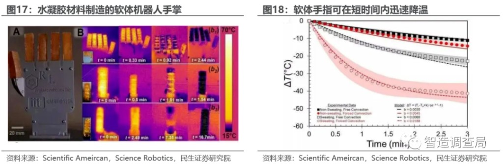 除了传统的散热方式之外,目前也有科研机构在不断探索更加类人的散热机制,比如 “排汗”。康奈尔大学的谢菲德研究团队开发了一种更利于柔性机器人的散热方式。由于柔性机器人很多部件都是由复合材料制成,其散热性能不如金属,而风扇灯内部散热技术占空间较大,重量也较大,因此,谢菲德发明了机器人的 “排汗系统”。