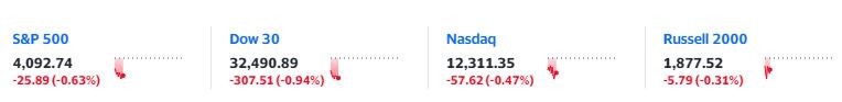 美股集體低開後跌幅迅速擴大,道指開盤便跌超百點,25 分鐘內跌幅擴大至 1% 或超 300 點,標普 500 指數大盤跌幅也翻倍至 0.7%,納指跌約 0.6%,羅素小盤股跌約 0.3%。